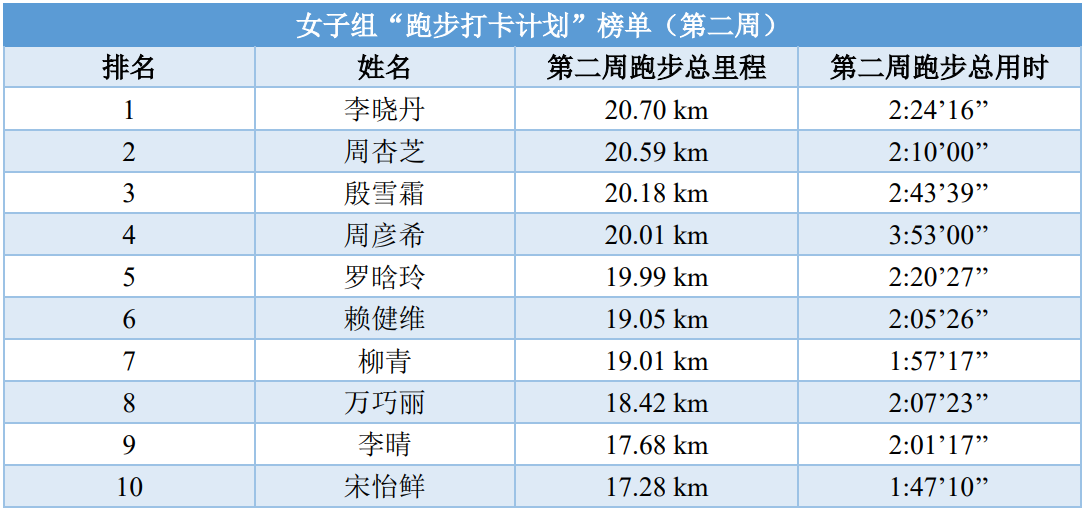 跑步打卡计划开展两周以来男、女生累计跑步总里程前十名的选手名单及跑步里程数公布如下:
