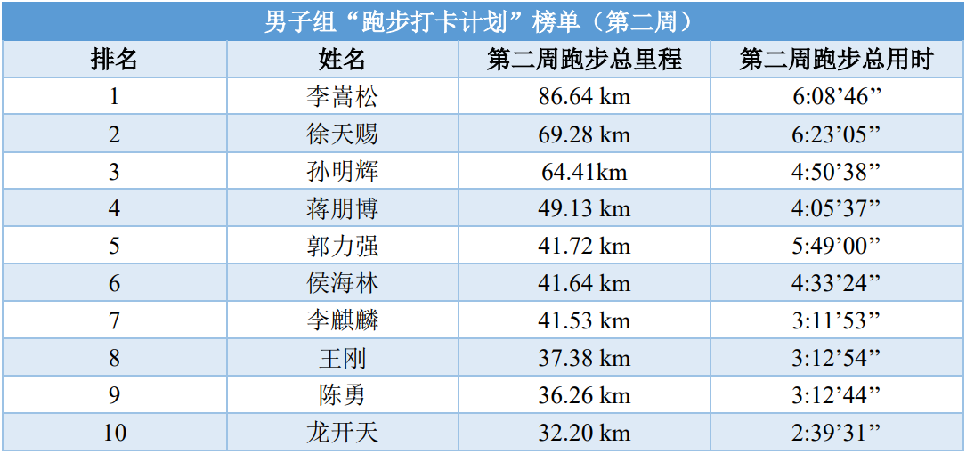 本周为跑步打卡计划活动开展的第二周,气温较上周明显降低,但参赛同学依旧保持着高涨的热情,参与到了跑步打卡计划之中;操场上、校园里处处可见同学们跑步的身影。跑步打卡活动已开展过半,希望参赛队员能再接再厉,为打卡里程数做后半程的冲刺!现将跑步打卡计划第二周即3月20日至3月26日七个活动日中,男、女生累计跑步里程前十名的参赛者名单及跑步总里程和总时间公布如下: