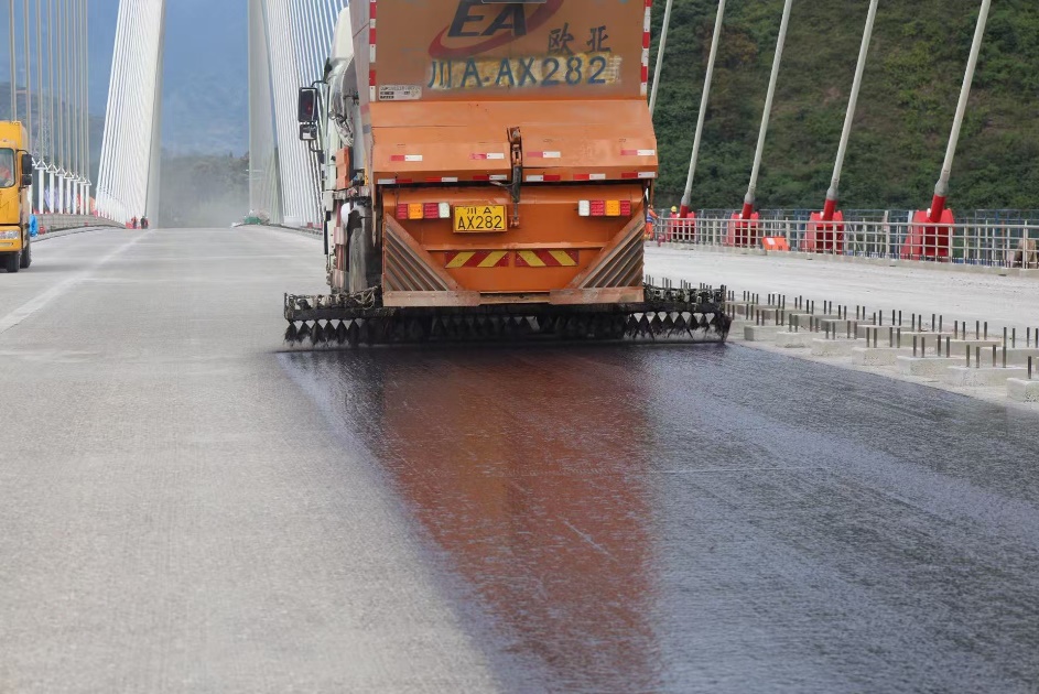 2025年10月19日,历经三天现场紧张施工,沿江高速新市金沙江特大桥桥面新型防水粘结层试验段顺利完成施工,标志着四川境内特大桥桥面防水新技术的又一次重大突破。