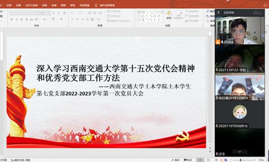 在支部书记简洁的自我介绍之后,第七党支部全体成员开启摄像头,来了一次别开生面的线上见面会。同学们朝气蓬勃,斗志昂扬,完美展现了新时代青年的生机活力。