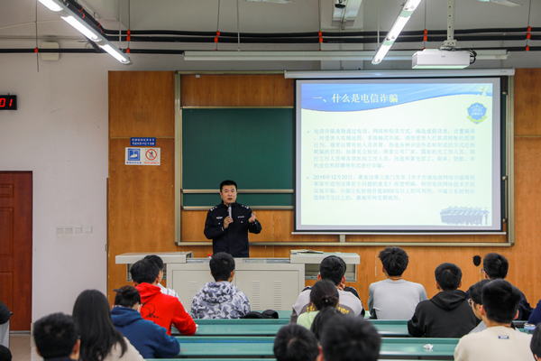 首先,陈警官引出电信诈骗的定义,大致介绍了刷单诈骗、冒充公检法诈骗、买卖游戏装备诈骗、网络贷款诈骗、裸聊诈骗等新型诈骗。他针对其中的网络诈骗、信用卡贷款诈骗等进行了深层剖析,指出相关诈骗行为越来越贴近大学生的生活层面。诈骗人通过一个个诱导陷阱,一步步夺取大学生的信任,最终实施诈骗。对此,陈警官希望同学们能提高警惕,警钟长鸣,时刻关注自己的财产安全。