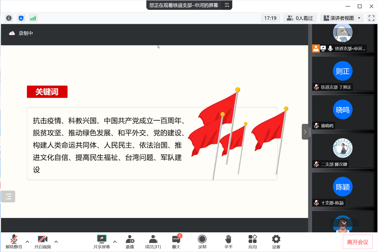 本科各学生党支部参与的党的二十大精神研讨会以线上会议的形式举行。出席本次研讨会的有支部指导老师雷晓鸣同志和各支部支委代表。