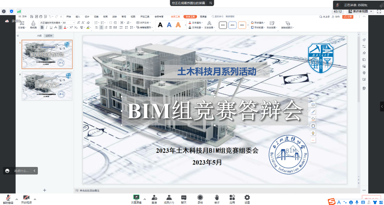 比赛正式开始进入答辩展示环节,各小组带上自己的ppt进入会议,按照按前一天抽签顺序展示自己的研究成果。在参赛选手的讲解下,老师与同学们更深入地了解了各组BIM技术的运用情况。在这里,交大学子闪动着思维火花、尽情挥洒着创意,比赛可谓精彩纷呈。