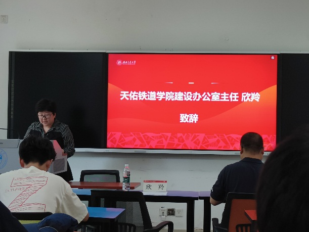 介绍完在场嘉宾后,天佑铁道学院建设办公室欣羚主任上台致辞。她首先对进入詹班同学表示了祝贺。并向同学们介绍了铁道詹天佑班的历史渊源,詹天佑班是学校为了弘扬詹天佑精神,激励交大青年学子热爱祖国、发奋图强、刻苦学习、勇于创新,培养立志为铁路现代化建设服务的优秀人才所设立的。