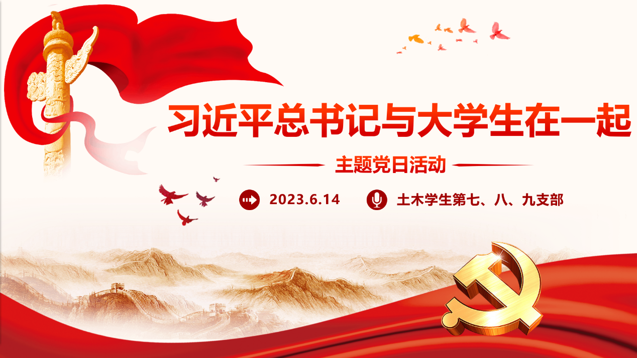 2023年6月15日晚19:30,为结合学习贯彻习近平新时代中国特色社会主义思想主题教育及“习近平总书记与大学生在一起”学习分享活动启动仪式精神,土木学生第七、八、九党支部开展了以学习习近平总书记到各大学视察时的重要讲话、习近平总书记对大学生的众多的回信回复等为主要内容的主题学习活动。土木学生第七、八、九党支部的全体党员同志出席了本次学习活动。