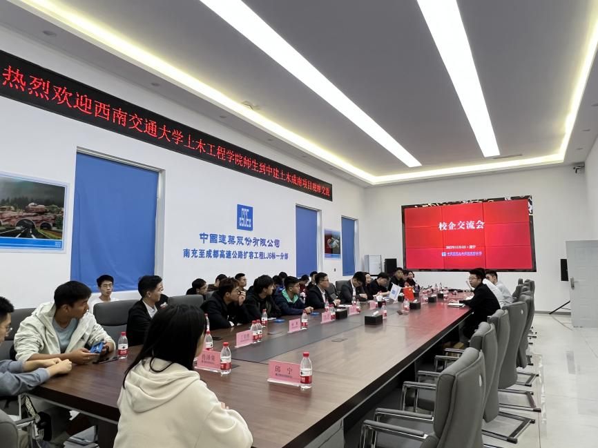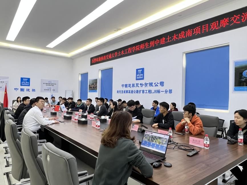 参观施工现场后,学院师生回到项目部会议室与企业进行座谈交流。会中,同学们踊跃发言,纷纷提出自己对于土木行业的疑惑,中建土木西南公司综合办公室主任、学院青年讲师团成员康升、成南高速扩容项目党建负责人牛天鹏耐心的为大家解答。牛天鹏表示,希望各位同学能够戒骄戒躁、自信自强,利用好大学生活,合理规划个人未来发展,做一个能够实现自我价值的人。李裕老师代表学院对中国建筑土木建设有限公司对此次活动的大力支持表示感谢。