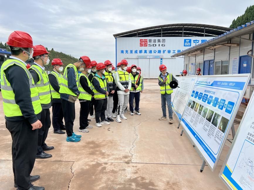 中午12:00,学院师生跟随企业代表前往中国建筑土木建设有限公司成南高速扩容项目部驻地用餐,短暂休息后,大家前往项目部会议室,成南高速扩容项目党建负责人牛天鹏为大家介绍了项目基本情况,项目安全总监为大家讲解了参观施工现场时的注意事项,随后大家前往成南项目陈家湾隧道观摩,施工现场站长为大家介绍了施工概况,并针对同学们的疑惑进行一一解答。