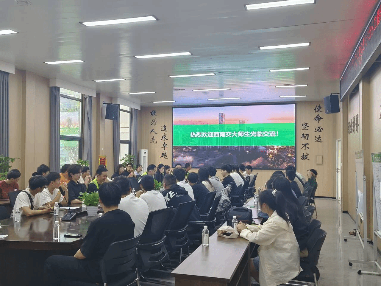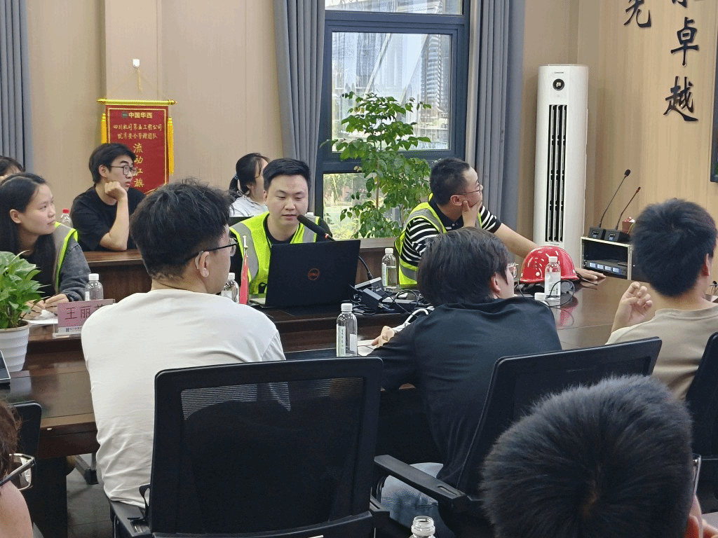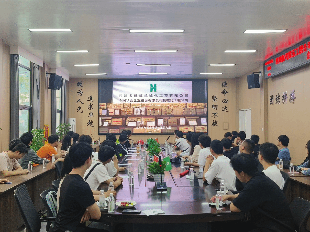 现场观摩完成后,学院师生来到项目部会议室参加座谈会。首先,学院师生观看了中国华西四川机司公司宣传片、城市更新片,由项目负责人介绍了麓湖生态城C7项目的概况及工程的重点难点,让同学们深入认识并了解企业。中国华西四川机司公司拥有房屋建筑工程施工总承包特级、建筑行业甲级设计资质以及其他各项总承包和专业承包资质共计20余项,长期以来,公司坚持“诚信经营,共谋发展”的经营理念,业务遍及全国,承建的工程荣获中国建设工程鲁班奖、中国土木工程詹天佑奖、国家优质工程奖、中国建筑工程钢结构金奖等国家和省市级荣誉120余项。