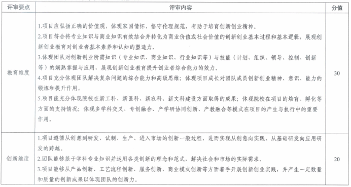 (1)五个维度评估(满分100分):评分标准根据第八届中国国际“互联网+”大学生创新创业大赛评审规则(创意组),对项目进行教育维度(30分)、创新维度(20分)、团队维度(20分)、商业维度(20分)、社会价值维度(10分)的评估。