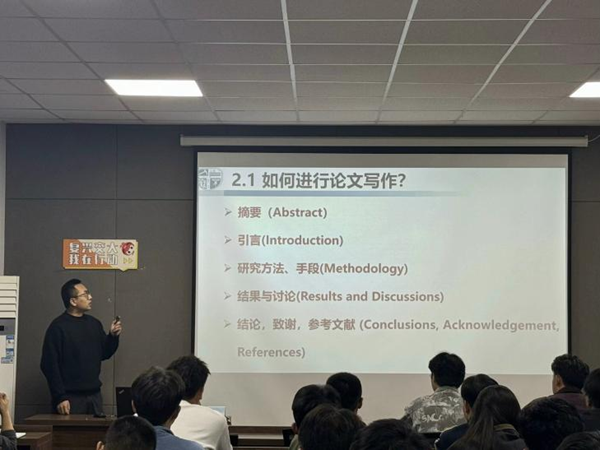 科研论文是科研成果的核心体现,也是衡量科研水平的重要评价标准。王师兄首先将一篇论文拆解为五个部分,分别从摘要、引言、研究方法、成果讨论和结论致谢与参考文献这五个维度切入,详细介绍了每部分应完成的内容,为同学们细致解读了每个部分应注意的写作要点,让同学们对如何撰写一篇高质量的学术论文有了更深入的认识。