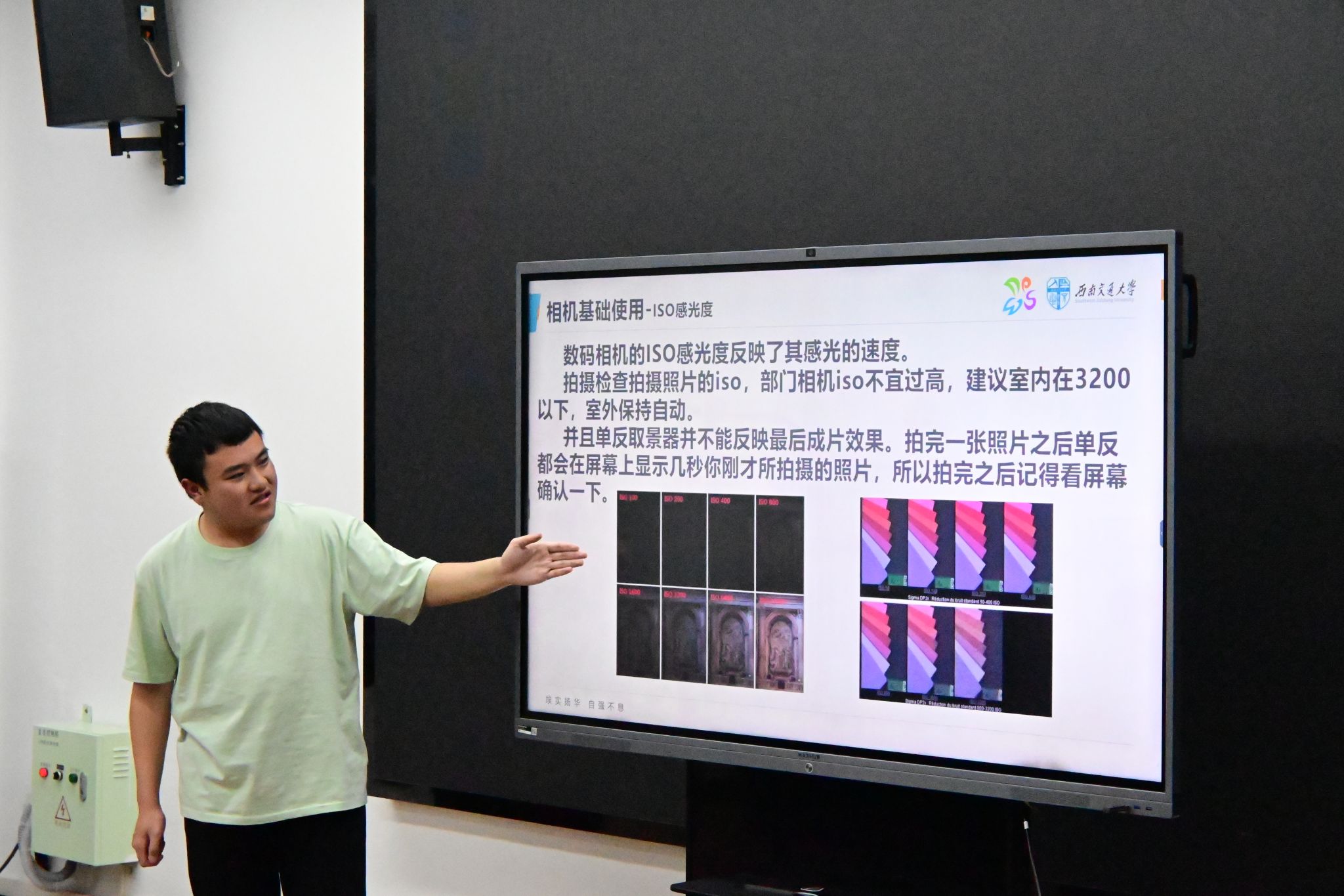 在活动摄影专题环节,何炳坚同学重点讲解了四个关键点:一是如何拍摄全景大图来展现活动氛围;二是人物特写的拍摄技巧,包括如何让主体自然融入场景以及相机参数设置;三是集体合照时的最佳参数配置;四是常见问题的解决方案,如拍摄角度选择、人物构图等。此外,他还详细地介绍了ISO调节、后期修图等技术要点。