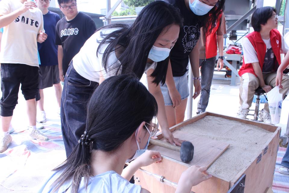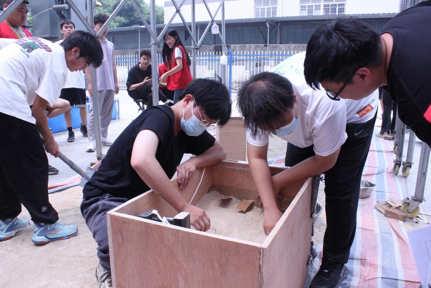 答辩结束后,比赛进入最后的实际加载环节,按照比赛流程将砂子填充至填充线,检查墙体情况以及填土位置,符合标准并且墙体没有崩塌则进入加载阶段,并由科创中心相关的负责人员对加载情况进行记录。