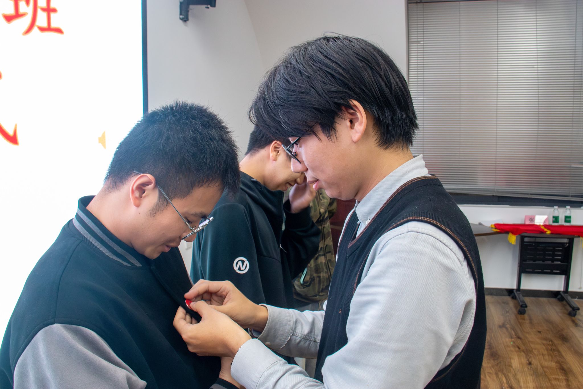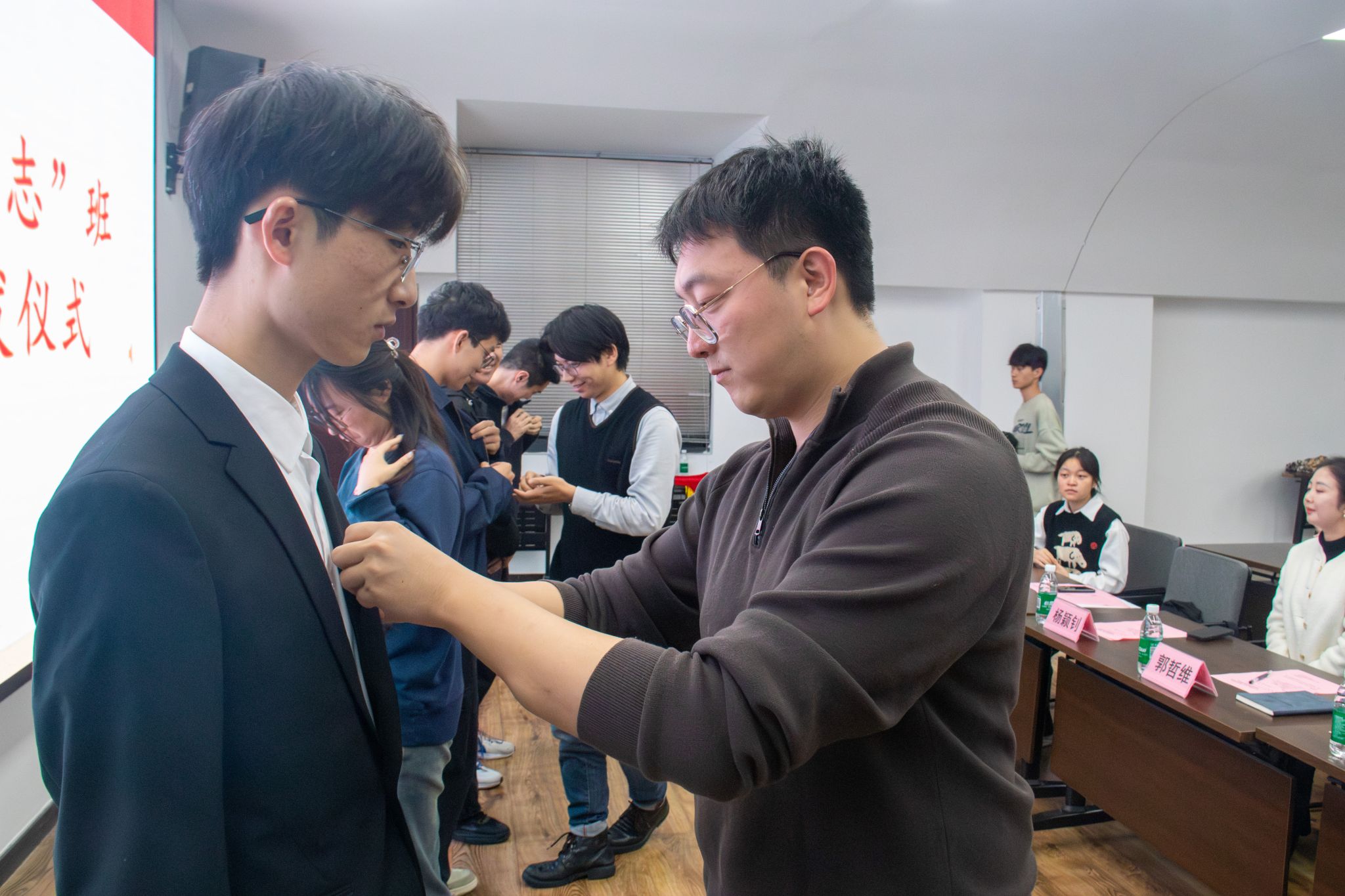 典礼第六项,郭哲维老师和张津毓老师为第六期“红志”班学员佩戴“红志”班班徽。