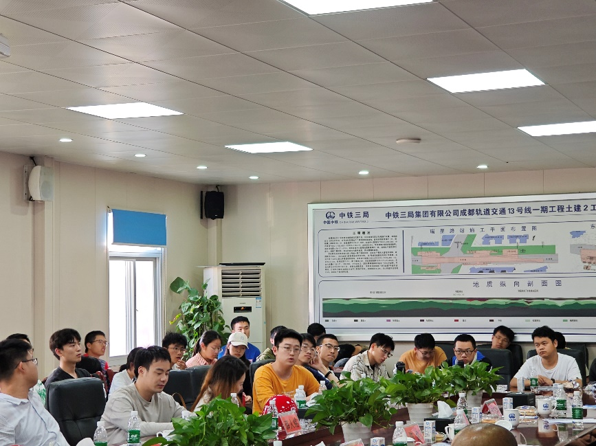 参观结束后,同学们回到会议室开展学生座谈会。中铁三局桥隧公司人力资源部副部长李进坤为大家介绍了现场嘉宾领导,中铁三局桥隧公司副总经理王熙、人力资源部部长王宇元、项目总工程师石鸿、人力资源部业务主管陈波,学院辅导员李裕、薛人铭、黄静汶、张进、孟迪老师出席座谈会。