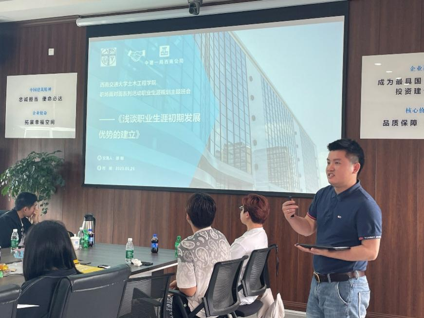 随后,企业生涯导师为同学们开展了主题班会,本次班会由三个环节组成,班会授课,经验分享,互动提问。首先,辅导员王童老师对项目部表示真诚感谢,同时对土木学院与14班的情况进行了简单的介绍。