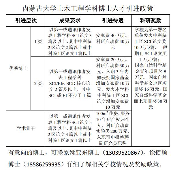 内蒙古大学土木工程学科博士人才引进政策