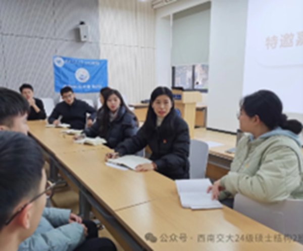 2024级硕士结构2班党支部自成立以来,高度重视党建工作,积极开展各类丰富多彩、形式多样的活动。自获批研究生党建“领航先锋”工程项目建设以来,通过理论学习、案例研讨、参观实践等多种方式,不断提升党员的理论素养与实践能力,充分发挥党组织的战斗堡垒作用和党员的先锋模范作用,扎实推进党建工作迈向新台阶。