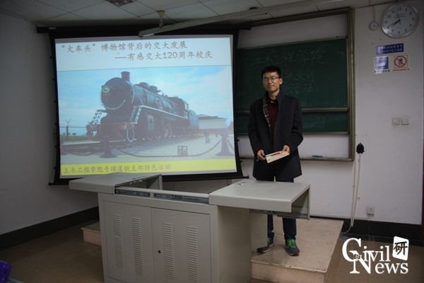 接着,支部书记陈代秀以PPT的形式,为大家讲述了“火车头”博物馆的基本情况。通过介绍使大家了解到,博物馆1期有5辆机车车头,分别是犀浦校区南门轨道上的一辆蒸汽机车和两辆才安放好的内燃机车、电力机车;停放在学校第四教学楼大厅里的米轨列车;停放在九里校区教育部磁悬浮重点实验室的磁悬浮列车。同时,陈代秀同学还从5辆机车出发,引出交大与中国铁路发展的密切关系。