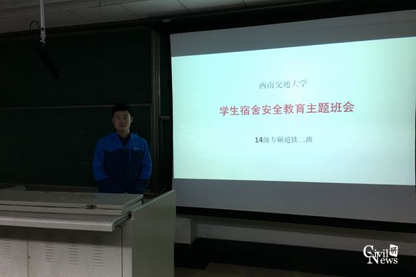 以及学校的号召,14级专硕道铁二班开展了以“学生宿舍安全教育”题为主题班会。此次班会于2016年11月9日晚在逸夫楼4309多媒体教室召开,由班长龚闯主持,14级专硕道铁二班全体学生参加了此次班会,并邀请了高速铁路线路工程教育部重点实验室的部分同学前来旁听和互动,促进了同学们之间的交流。