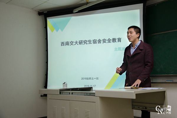 研究生2016级岩土工程1班于逸夫楼1304A教室顺利开展了“学生宿舍安全教育”主题班会活动。班会由该班班长艾健森主持,全体班级成员参加了班会学习。