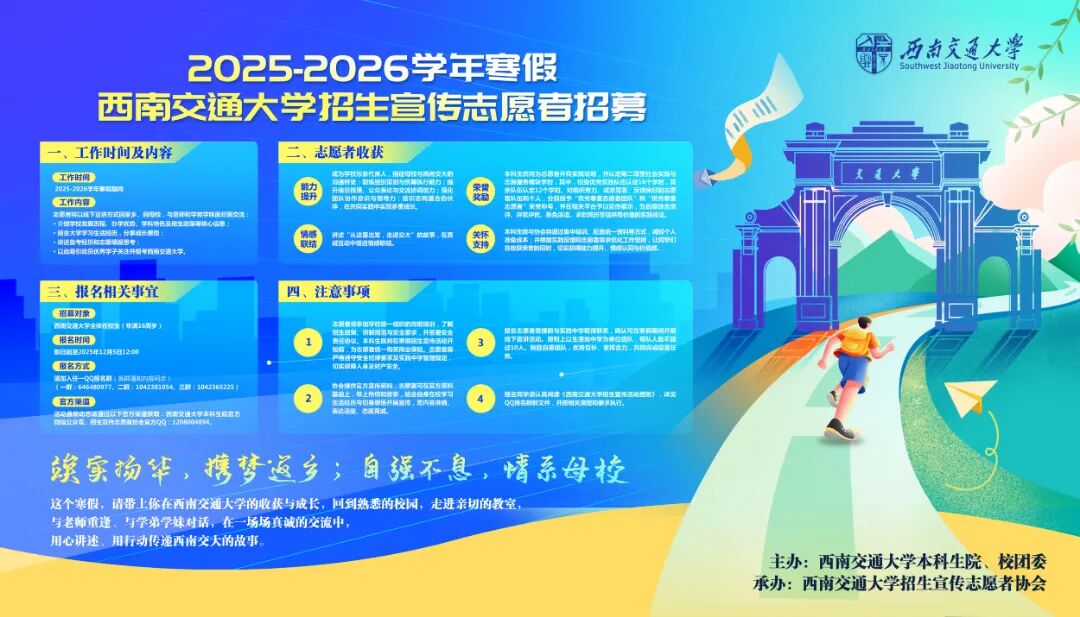 招生宣传志愿者协会决定实施“寒假高中母校行”品牌活动,现面向全校招募 2025—2026 学年寒假招生宣传志愿者。现将有关事宜通知如下: