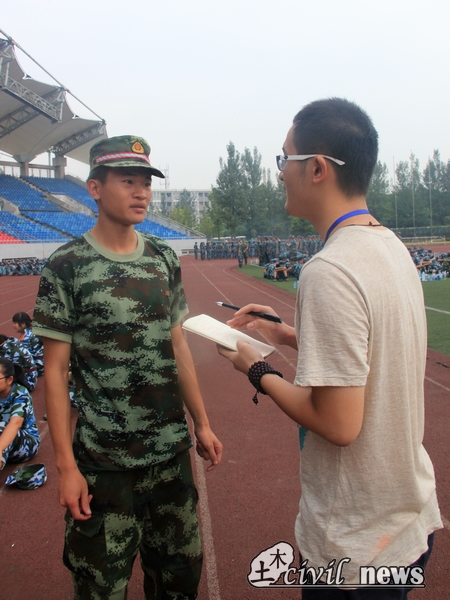 在人群中几度穿梭,最终笔者找到刚刚结束训练、正在休息的2营10连。10连的教官名叫游恒,下吧上黑黑的胡子茬配上绿军装,不由得显得有些沧桑,但他在接受采访时却略显得羞赧、紧张。游教官认为自己带的这一连新生总体而言都“特别认真、特别听话”,很有希望完成自己的短期目标——“在接受检阅、展开分列式的时候,孩子们能做到步调和上音乐节拍、排面标齐。”说到训练成果时,游教官有些自豪,他说:“通过训练,孩子们的意志力肯定更为坚强了,而且身体素质也显著提高了。第一天站军姿,15分钟就倒下去一片,现在站半小时都没问题了。”