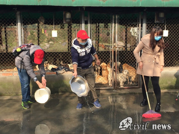 在保护中心,志愿者们遇到了来自成都中医药大学的几位志愿者,在了解了他们的工作内容之后,几位志愿者也加入了他们,一起对狗舍进行清洁,共同分担义工的一些工作。