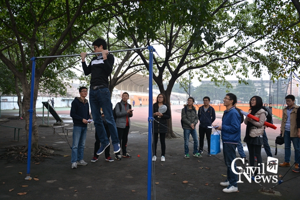 第二项活动非常受男同学欢迎,平时锻炼比较多的,此时终于可以大显身手了。勇于代表小组参赛的都还是有两把刷子的,做个十多个引体向上都不是问题。身体素质对未来工作和生活是非常重要的,尤其是土木这个行业,大家都要多多锻炼。