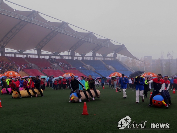 两个巨大的铅笔连在一起了,这是要干什么?原来这是一个名字叫做“快乐铅笔”的趣味活动。游戏规则如下,一男一女以排山倒海之势将并排起来的两支大铅笔从笔尖竖起来,接着又放倒,又从笔头竖起来,再放倒,一直重复到终点,计时最少者即为优胜者。初次看去,似乎不难,不过参赛者表示,这并不是一个简单的活动。比赛开始过后,各组在细雨中翻滚着铅笔。其中有一组的男生刚把铅笔竖起来,搭档的女生没有及时矫正方向,直接就看见铅笔向身上砸过来了,吓得尖叫了一声,赶忙跑开,铅笔也随之倒在了地上。这也引来了场外观众的阵阵欢笑。