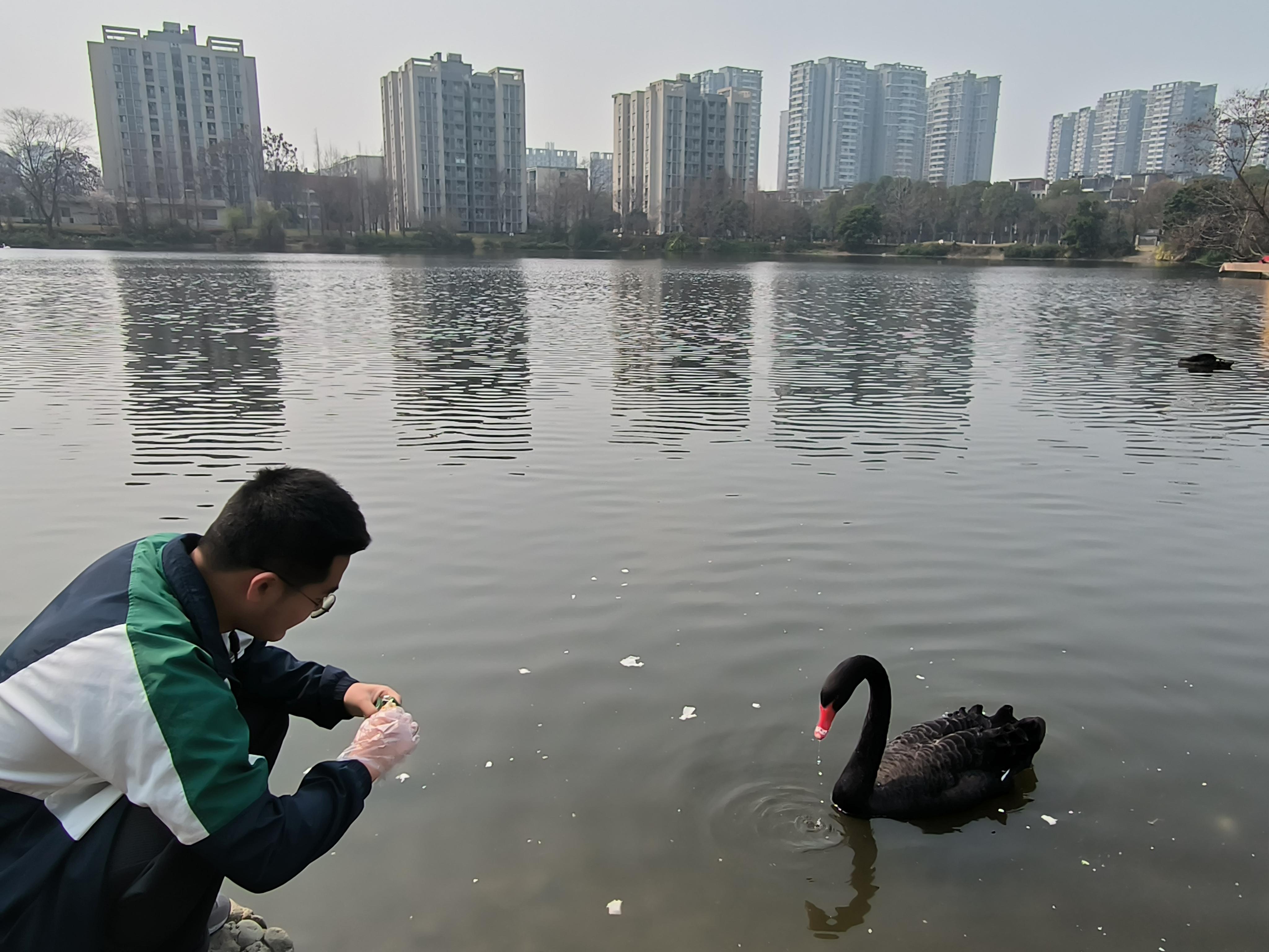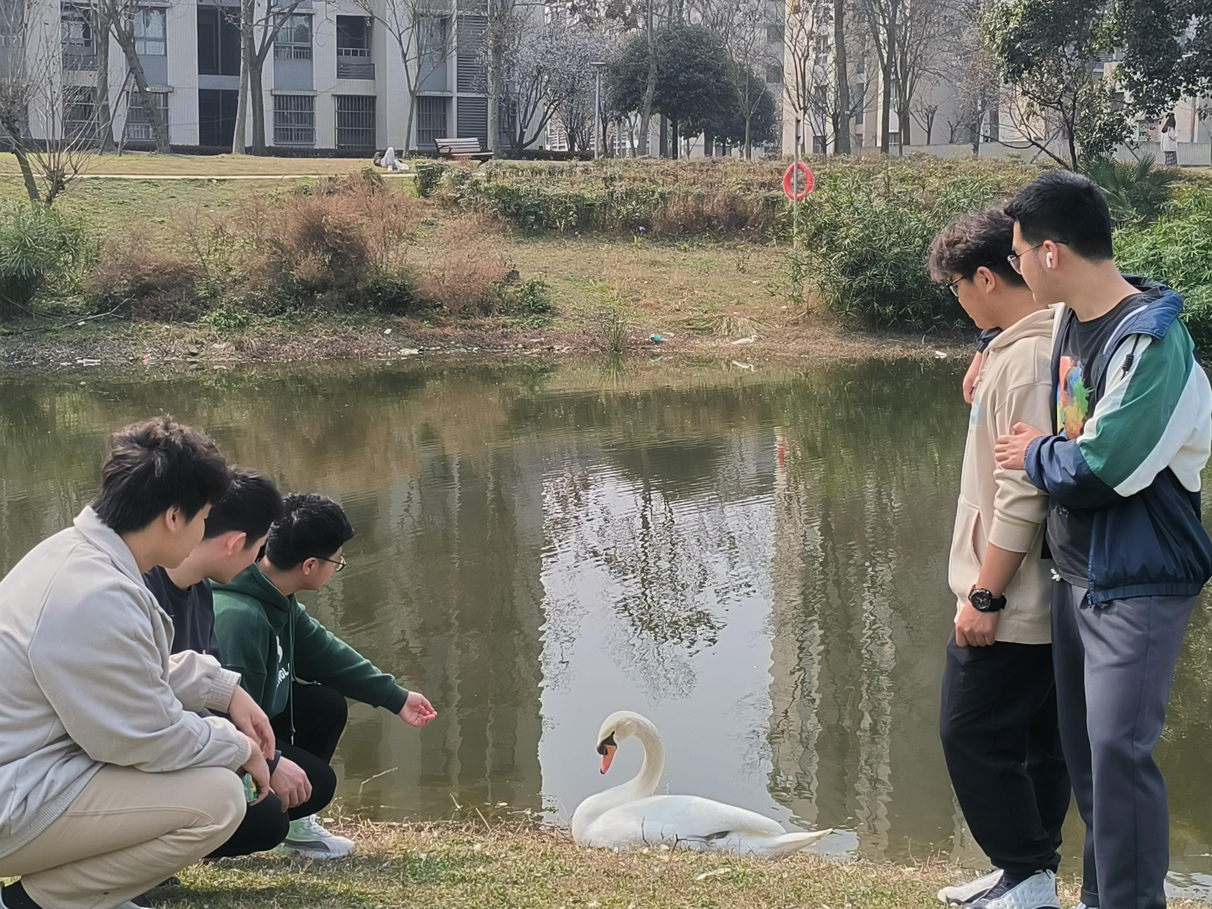 时逢早春,景色正好,午后阳光十分和煦,湖面波光粼粼,值此春景,3月5日下午2:00,土木园区管理中心举办了“校宠卫士”活动,同学们积极参加,争相与校宠天鹅共赏春色,我们的校宠天鹅在湖中悠然自在,亦或是与游人互动。岸上春花烂漫,草木待苏,如此春景,与伊人共赏,或是一人游融入这美景中,时而与校宠来一次亲密的互动,也算是一段惬然的时光。