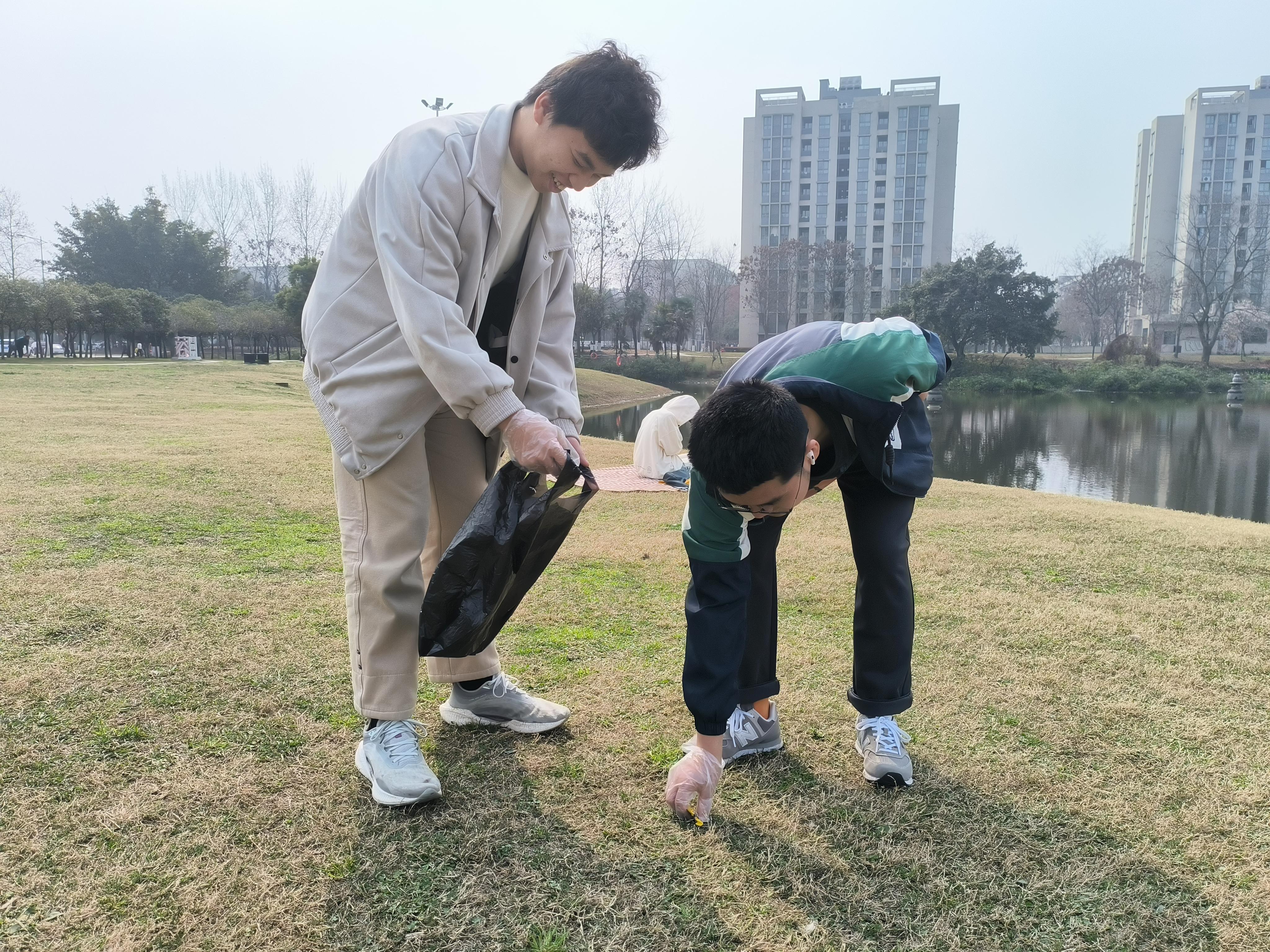 在欣赏美景的同时,志愿者们也发挥不怕脏、不怕累的精神,手持铲子、火钳、垃圾袋等工具,认真用心地清扫犀湖周边垃圾,捡拾漂浮在湖面的垃圾、杂草、枯烂树枝等漂浮物,使湖面更加清澈。在削减垃圾的同时,更需要控制垃圾的产生,因此,志愿者们也劝导周围的同学们,观景需文明在欣赏美丽风景与可爱校宠的同时,也要注意保护生态安全