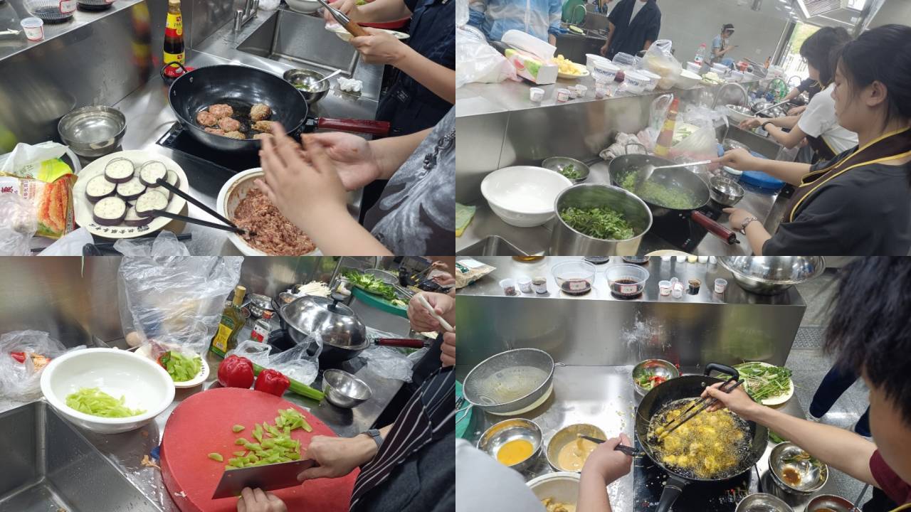 团委书记刘萍,“食话食说”选修课老师余洋洲,辅导员李阳阳、黄静汶、高峦、谢欣岑参与了本次活动。经过初赛的选拔,共有10组选手入围决赛,随着评委宣布比赛的开始,选手们开始了紧张的筹备工作,从菜品选择到创意摆盘,选手们都动了不少脑筋,每一步都充满巧思。切菜、腌肉、爆炒……美食制作的每一道工序都由同学们亲自完成,有条不紊的制作着。比赛时间接近尾声,一道道美食也相继出锅。金黄酥脆的大虾让人垂涎欲滴,雪碧话梅排骨让人食欲大增,珍珠丸子颗颗饱满白嫩……