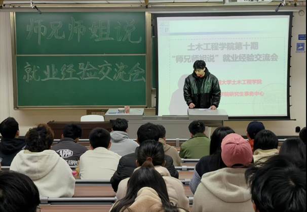 20253201930,第十期师兄师姐说就业经验分享会在九里校区4323举行,由岩土工程的余康鑫师兄和桥梁与隧道工程的李斯博师兄为大家分享了求职过程中的经验与感悟。