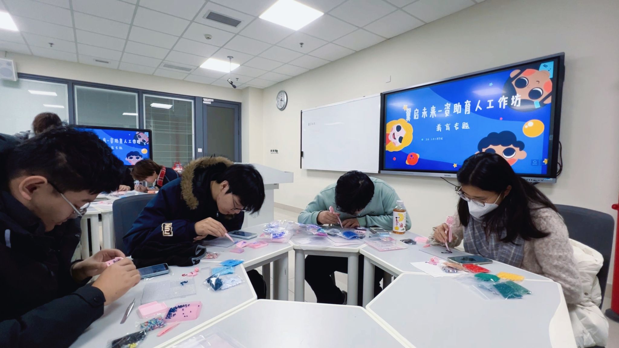 本次活动以趣味十足的“拼豆创作”为美育实践载体,通过手工创作的沉浸式体验,引导受助学生在动手实践中发现美、创造美、感悟美。活动伊始,工作坊指导老师贾璇琦主持开场并阐明活动主旨。她表示,资助育人不仅要为学生提供物质保障,更要关注其精神成长与全面发展,本次美育主题活动正是基于这一理念开展,希望同学们能暂时放下学业压力与电子设备,全身心投入手工创作的乐趣中,在色彩搭配与造型设计中激活审美感知,在专注实践中锤炼耐心与匠心,同时在互动交流中增进同学情谊,让美育滋养心灵、赋能成长。