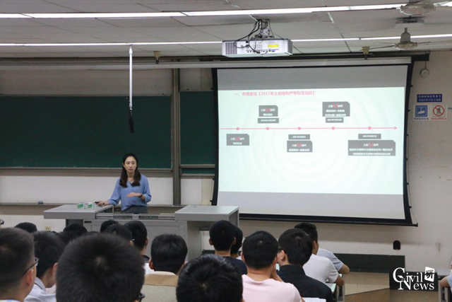 首先,由东原集团成都公司16届管培生严寒给同学们就地产行业在近两年的市场变化、市场机会两个方面做了介绍。同时针对这两年尤其是近期国家对于房地产行业出台的一些政策做了剖析,对于后期的房地产产业的发展潜力做出了也做出了解析。