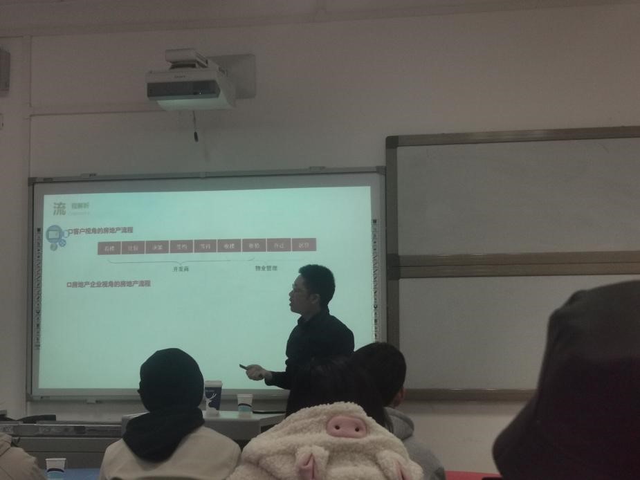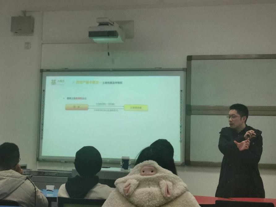 紧接着,杨飞老师结合自己的工作经验以及对房地产行业的认识,将同学们的思绪带到房地产市场这一领域中来。他认为作为大学生尤其是土木学院的同学们来说,提早了解房地产市场是作用巨大的。杨飞老师从法律的角度介绍了土地性质及所有权、土地使用权等内容。随后结合自己遇到的例子向大家介绍了房地产的开发等相关内容。