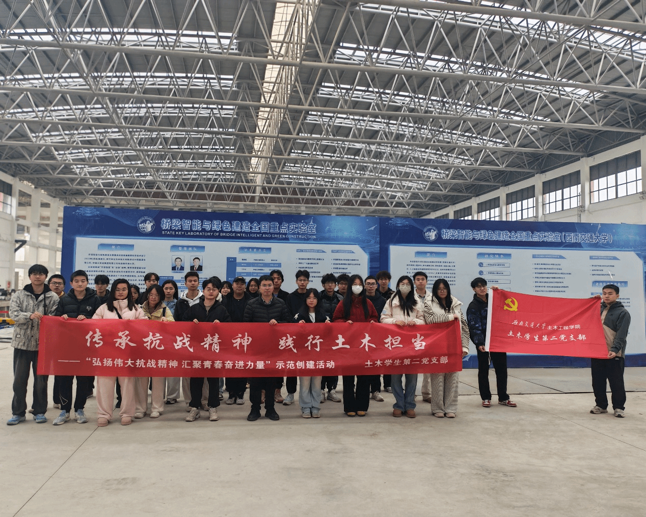 土木学生第二党支部精心组织支部党员与入党积极分子,赴桥梁智能与绿色建造全国重点实验室开展“传承抗战精神,践行土木担当”主题实践活动。本次活动特别邀请实验室张明金老师全程带队讲解,为参与成员提供了兼具深度与温度的专业指导。
