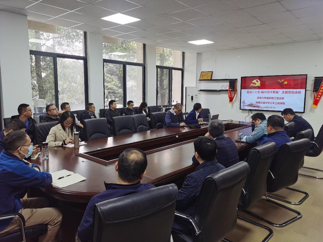 道路与铁道工程系党支部线下召开了“喜迎二十大·交大复兴有我”的主题党日活动,旨在深入贯彻学习学校第十五次党代会精神,激励全体成员更加坚定、更加自觉地践行初心使命,持续奋斗,以实际行动迎接党的二十大胜利召开。参会人员为道路与铁道工程系的全体教工党支部,本次会议由党支部书记阳恩慧同志主持。