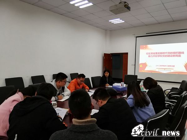 2018年11月15日下午16:00,土木学工组党支部在犀浦X4312会议室开展了“切实贯彻落实新时代党的组织路线,奋力开创学校党的建设新局面”主题党日活动。本次主题党日活动主要观看学习了全国组织工作会议相关视频,集体学习全国组织工作会议习近平总书记重要讲话精神解读。本次活动由党支部书记刘萍主持。