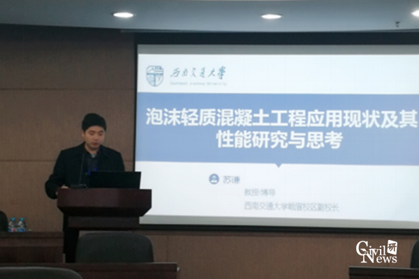 苏谦教授向与会专家、学者做了题为“泡沫轻质混凝土工程应用现状及其性能研究与思考”的学术报告,介绍了团队在泡沫轻质混凝土方面的研究进展和未来思考。