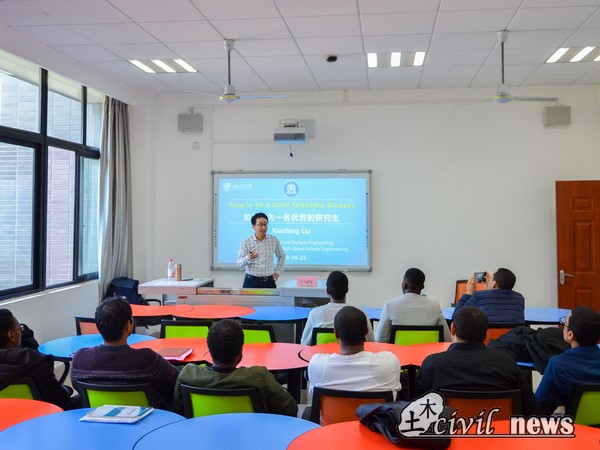 下午2点,留学生们来到X4137教室,参加由刘先峰教授主讲的新生入学教育专题讲座。为了让留学新生们更快适应新生生活和早早地进入学习状态,刘教授就如何成为一名优秀的研究生这一话题为留学生们做了生动的讲座。刘教授提出,要成为一名优秀的研究生,需要具备四个基本素质——社会责任,创造能力,批判思维和高尚品质。刘教授期望留学新生们要努力创造,勇于探索,用批判的眼光看世界,脚踏实地地去实现自己的理想。经过一小时的交流与聆听,留学生们收获满满,下午的教育讲座走向尾声。