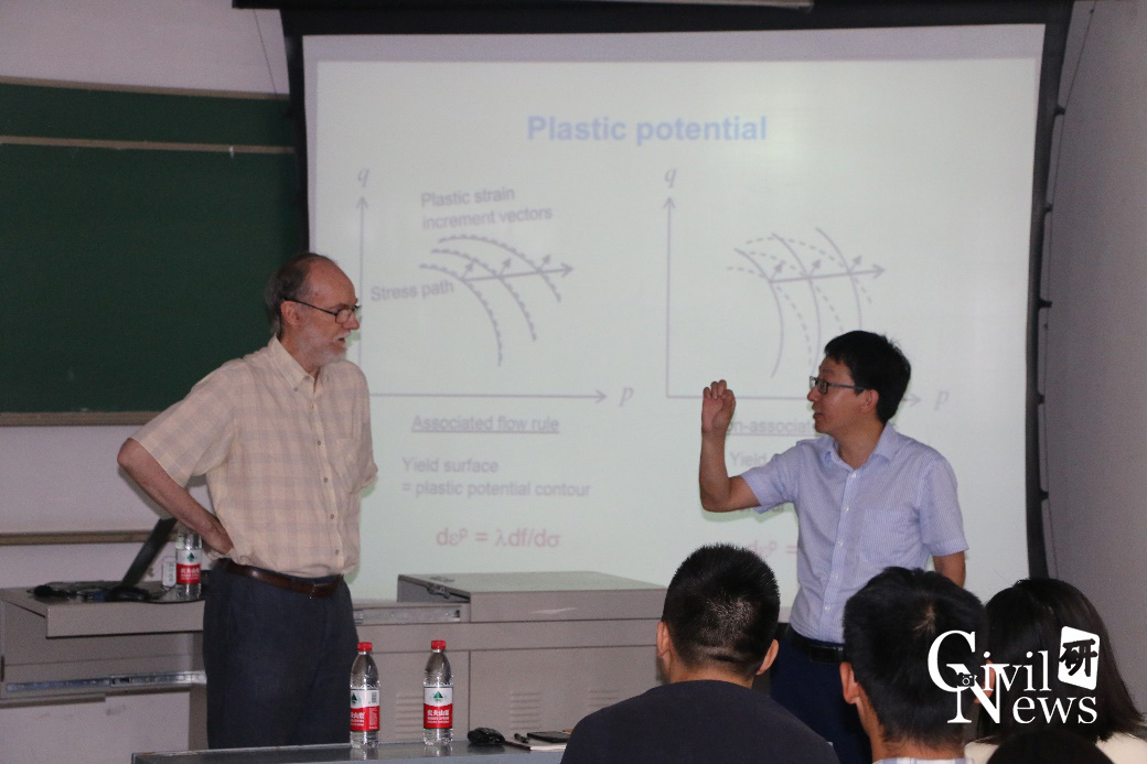 7月3日与7月4日上午十点,Hicher教授讲了关于岩土工程数值模拟中有关有限元和有限差分法等内容。在讲座的休息时间,师生们结合自己的科研方向与Hicher教授进行了充分的交流,Hicher教授耐心地对师生的提问一一作了详细解答。