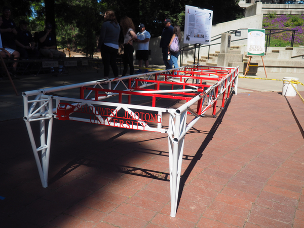 19号到21号三天内,钢桥队员们在Display(外观展示)、Construction Speed(建造速度)、Lightness(重量)、Stiffness(刚度)、Construction Economy(建造成本)、Structural Efficiency(结构效率)这六个方面与国内外队伍比拼,最终荣获中太平洋赛区钢桥比赛总分第五名的佳绩,并在Display(展示)环节获得第一名。本届参赛钢桥采用上承式受力,鱼腹梁结构和三角形平联,并在涂装设计方面取材于川剧,以红黑白为主色调,加饰脸谱花纹,取名为“众生百面”(The Mask)。