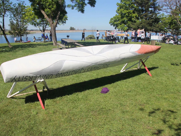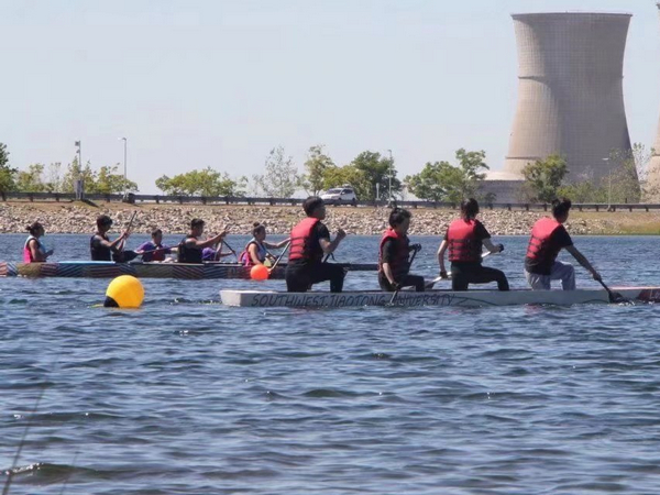 在此期间,轻舟队也在Oral Presentation(口语答辩)、Final Product(成品展示)、Design Paper(设计书)、Race(划船比赛)四方面力求上游。本届的交大轻舟外观由红、白、灰三种彩色混凝土组成,曲折的弧线勾勒出传统国画中荷的形象,取名“Lotus”。为达到最优稳定性和速度,船尾到船头采用u型到v型过渡,船头船尾位置增设浮仓。轻舟赛不仅仅是结构的较量,也是英语能力和身体素质的较量,设计书的撰写、答辩及评委提问环节无不考验着参赛者的英语水平,而划船竞赛更是富有体育性质的身体较量。最终,首次参赛的轻舟队获得比赛总分第六的好成绩,为下一届轻舟队指明了前进方向。