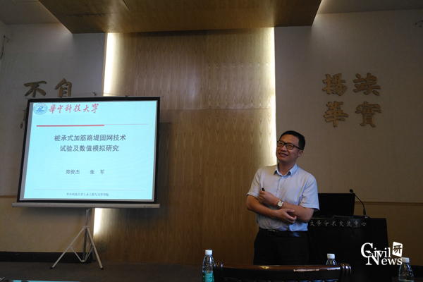 郑院长首先介绍了传统桩承式加筋路堤工程的应用范围和不足之处,让大家对桩网结构的原理和工程应用有了更为全面的认识和理解,从而引出其团队通过对传统桩网结构的改进和优化而提出的一种具有刚性垫层加固效果的新型固网技术。然后详细的为大家讲解了该技术研发过程的主要思路,即通过现浇混凝土将筋材固定于桩顶,利用土工格栅的张拉膜效应将使其上部荷载有效的传递到桩体部分,从而大大减小了桩间土的应力分摊比,达到减小路基沉降的目的。为了让大家更形象的了解其作用原理,郑院长还在现场为大家展示了该结构所采用的新型等边三角形土工格栅,其能够在360度方向承受张拉荷载,较传统矩形结构具有明显的强度和稳定性优势。在座的师生们无不对郑院长的学术功底和创新精神赞叹不已。最后刘先峰教授对郑院长的讲座进行了点评和总结,在座的老师和学生都积极发问并对相关问题与郑院长进行了探讨。