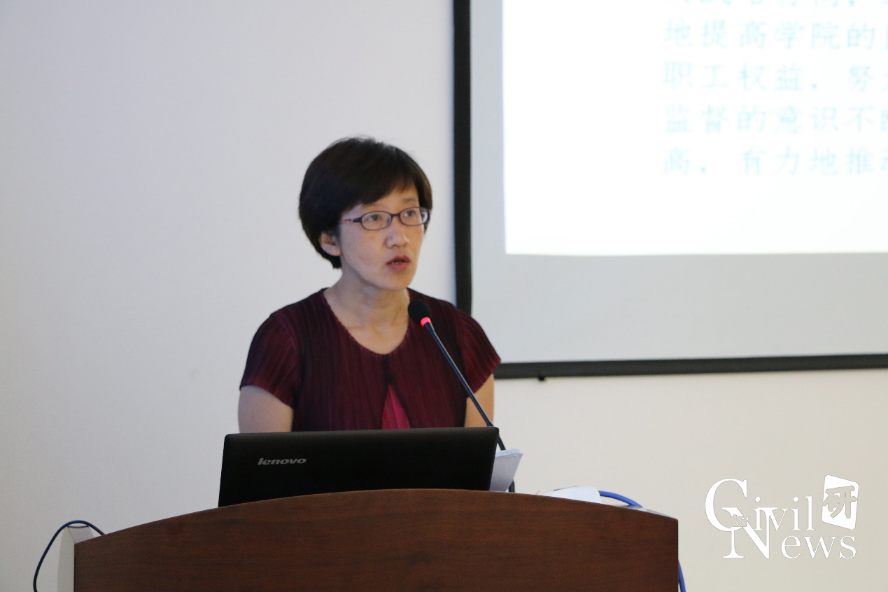 接着,由土木学院工会主席李彤梅作双代会工作报告和上届工会经费使用情况报告。李彤梅主席以“不忘初心,紧跟时代,团结动员全院教职工助力学院创一流改革”为主题向学院新一届双代会做上届双代会的工作报告。在报告中,李彤梅主席对上一届的工作进行了全面的回顾,五年来学院工会建立健全了学院二级教代会制度,推进了学院民主管理的和谐发展,组织开展了丰富多彩的教职工文体活动,推进了校园精神文明建设,取得良好成效。对于接下来的工作,李彤梅主席指出,首先要认真贯彻学习党的十九大精神,把握工会工作正确的发展方向,加强工会的自身建设;其次,要坚持以人为本,突出工会维权职能,为教工办实事;最后还要大力发展丰富多彩的文体活动,努力创建和谐文明的校园环境,构建一流工会。同时,对于上一届工会的经费使用情况,李彤梅主席也做了详尽的介绍,做到了工会财务公开,透明,得到了在场老师的肯定和赞许。