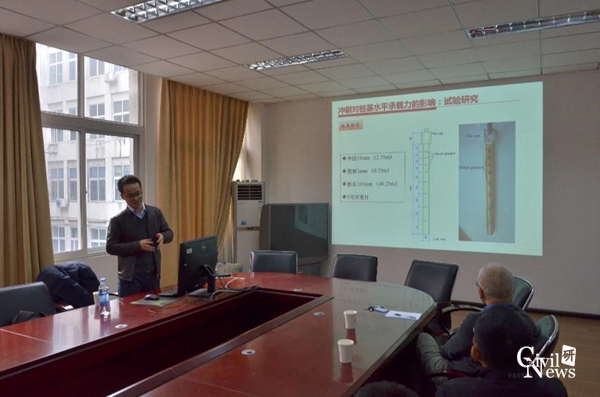接着,漆文刚研究员就实验设备介绍、近海桩基局部冲刷及其影响、桩基防冲刷措施简述、未来研究的几点想法四个部分与大家开始了详细认真的学术讲解。漆研究员根据现场的同学大多来自桥梁工程专业,灵活的调整讲解重点,把最能吸引同学,最让同学们感兴趣的桩基础方面的知识做了详细讲解。