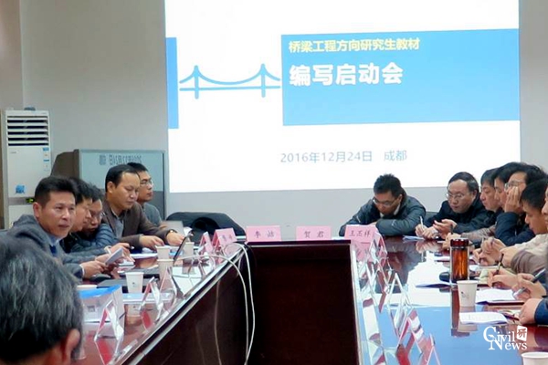 2016年12月24日,由人民交通出版社主办、桥梁工程系承办的“桥梁工程专业研究生教材”编写启动会在我校土木馆召开。来自我校与人民交通出版社、同济大学、重庆交通大学、东南大学、浙江大学、湖南大学、北京交通大学、河海大学、长安大学、武汉理工大学、福州大学、长沙理工大学、东北林业大学以及中交第一公路勘察设计研究院的教授、专家、学者近30人汇聚一堂,就“钢与组合结构桥梁理论”、“桥梁结构试验”与“桥梁有限元分析”(暂定名)三本桥梁专业研究生教材的编写进行磋商。