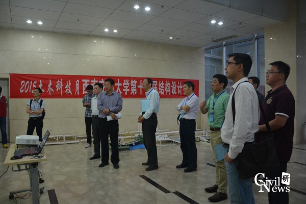 第十五届结构设计竞赛”桥梁组决赛进行时,评估组专家在芒果视频