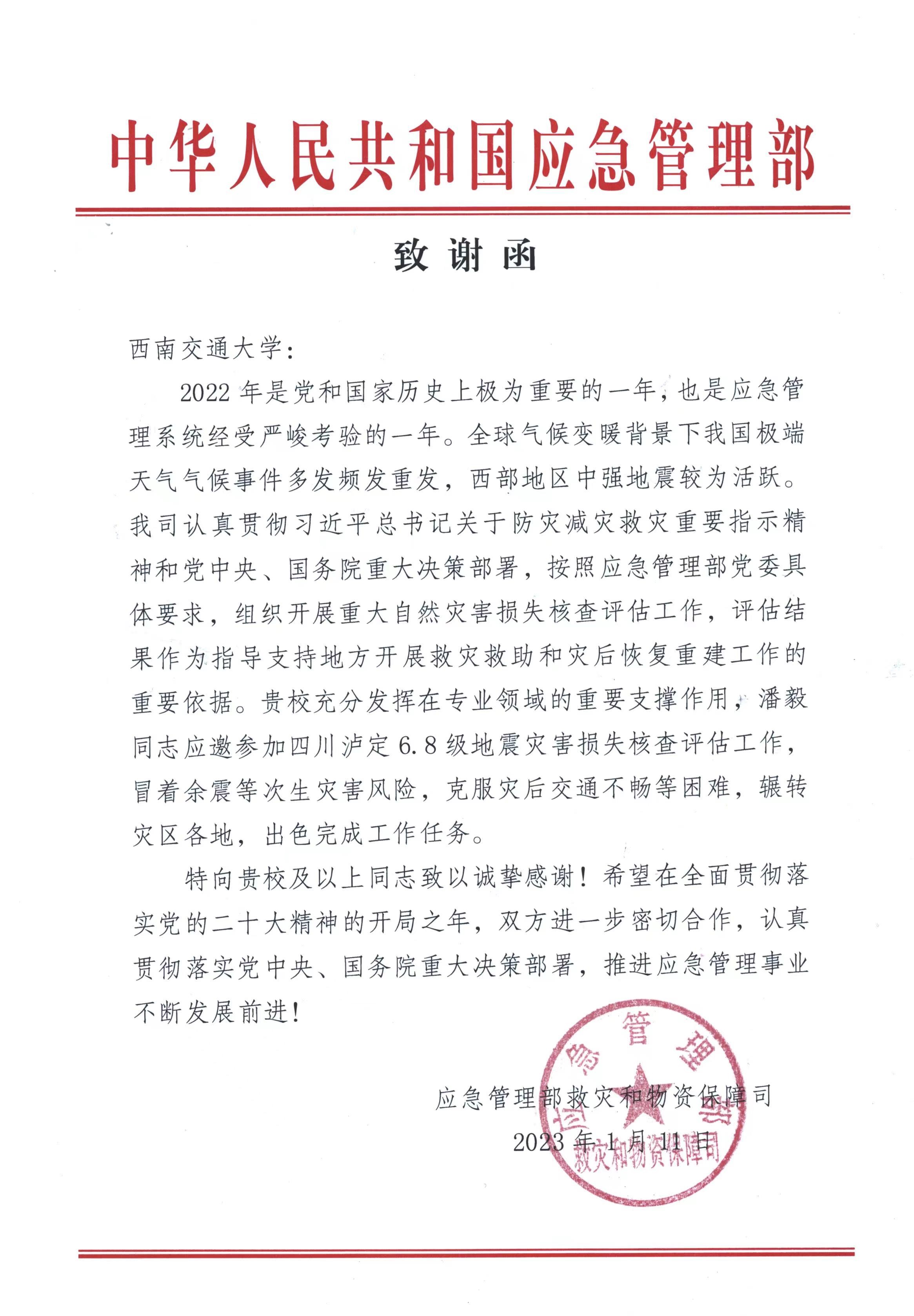 从9月6日至29日,潘毅老师分别受邀参加了应急厅、应急部、住建厅等三个专家组,冒着余震和次生灾害风险,在山高坡陡、地形复杂的作业环境中,出色完成了应急评估、灾损核定、震害科学调查等3个阶段任务,足迹踏遍石棉、汉源、九龙、泸定、康定、荥经等6个受灾市县,走过20余个乡、镇,调查范围覆盖了6~9烈度地区,海拔从700多米到4000多米。潘毅老师参与完成的灾损评估报告和震害调查报告得到了各级部门的肯定,为科学有效推动灾后恢复重建工作提供了详实依据,具有重要意义。在关键时刻,潘毅老师表现出了一名共产党员的担当与责任,他丰富的抗震救灾经验和过硬的专业技术能力,受到了国家应急管理部的充分肯定,特向学校发来感谢信。2022年,潘毅老师还与土木学院铁道系陈嵘老师、建工系周袆老师参加了芦山地震和马尔康地震的抗震救灾工作,受到了省应急厅的通报表彰。